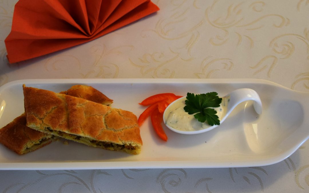 In der Mitte die ausgekühlte Fülle verteilen, zusammenklappen, in der Mitte mit der Gabel festdrücken und mit Ei bestreichen. Bei 180°C Heißluft 25 min. backen.